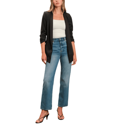 This collarless longline blazer features a soft shawl neckline and 3/4-length ruched sleeves for a polished yet effortless look. Designed in a soli...