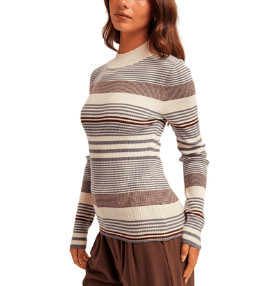 This ribbed sweater top features a variegated stripe pattern and a mock neckline for a polished yet modern look. Designed with long sleeves and a s...