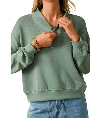This V-neck long sleeve zip-up top combines a sleek silhouette with an ultra-soft, comfortable feel. Designed for easy everyday wear, it features a...