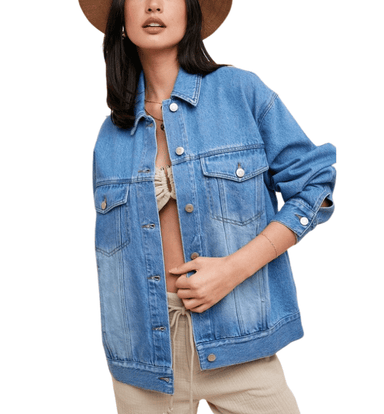 This garment-washed denim jacket features an oversized, boyfriend-inspired fit for an effortlessly cool look. Designed with double breast pockets a...