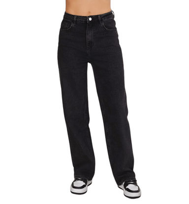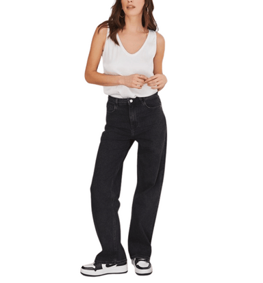 These washed black straight leg jeans feature a flattering high-rise fit with a 12-inch rise and a 31.5-inch inseam. Crafted from a comfortable ble...