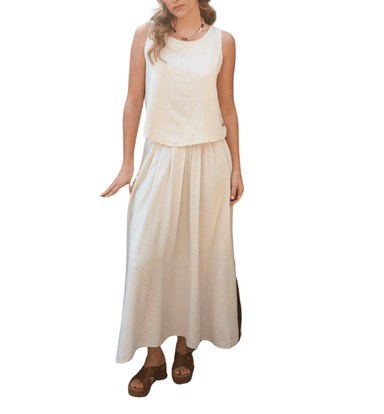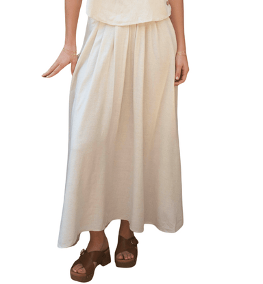 Breezy and chic, this high-waisted maxi skirt features a flattering back elastic tunnel, front pleats, and a flowy handkerchief hem. Crafted from a...