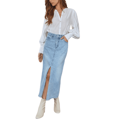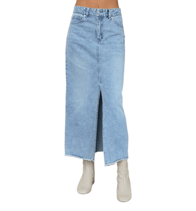Elevate your wardrobe with our effortlessly chic Denim Maxi Skirt. This versatile piece features a stylish front slit, adding a touch of modern fla...