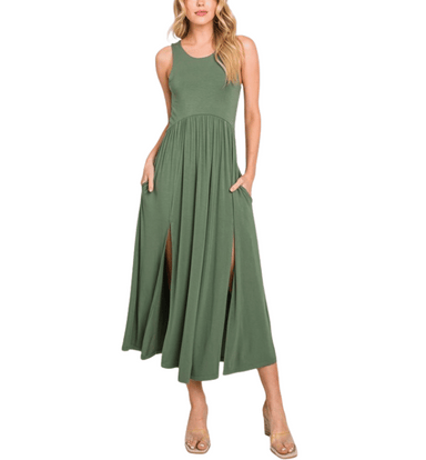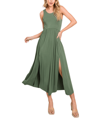Sleek and effortless, this sleeveless midi dress features flattering waist shirring and a front slit for a touch of edge. Crafted from soft, stretc...