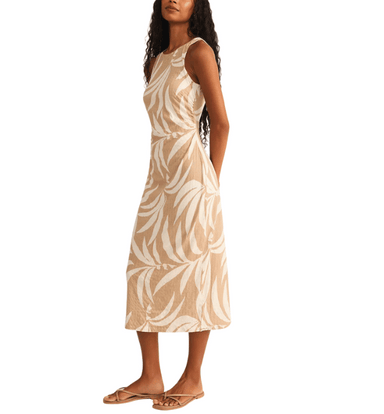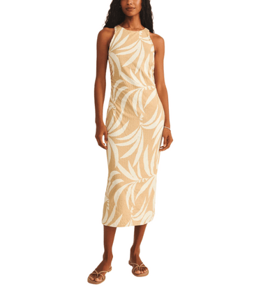 Z SUPPLY: A tropical-print dream, this fitted midi dress brings vacation vibes anywhere you go. With a sleek silhouette, front-side shirring, and a...