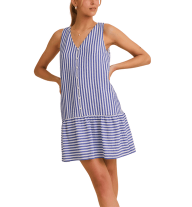 This sleeveless stripe dress features a flattering V-neckline and button-up front for an effortlessly polished look. Lightweight and easy to style,...