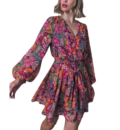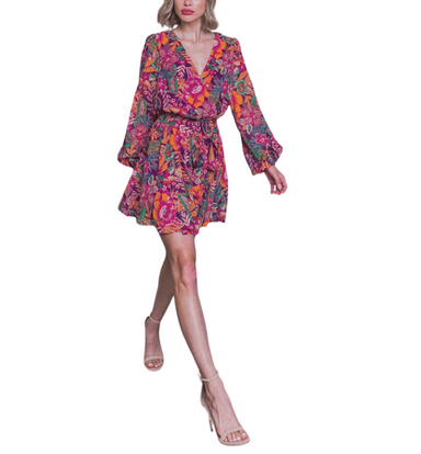 A playful yet feminine favorite, this printed woven mini dress features a flattering surplice neckline, long sleeves, and an elasticized waist with...