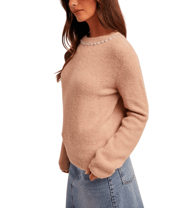 Pearl Detail Fuzzy Cable Knit Sweater featuring a cozy cable knit texture with soft fuzzy yarn and elegant pearl accents. This long sleeve round ne...