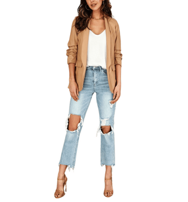 View full detailsElevate your style with the Frankie Ruched Sleeve Faux Leather Blazer. This chic blazer features a sophisticated camel color and a modern twist wit...