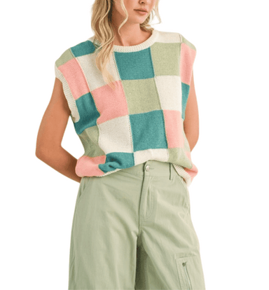 Colorful Checkered Summer Sweater Vest Add a pop of color to your summer wardrobe with this vibrant multi-color checkered knit sweater vest. Featur...