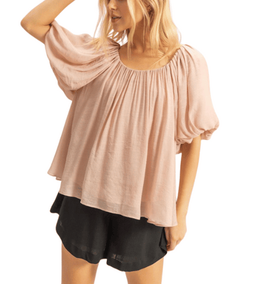 This breezy top features a shirred neckline, short puff sleeves, and a relaxed, flowy silhouette for effortless style. Perfect with denim shorts an...