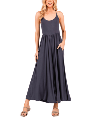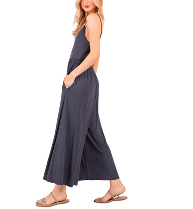 This wide-leg cami jumpsuit features a flattering flare fit and adjustable spaghetti straps for an easy, effortless look. Made in the USA from a so...