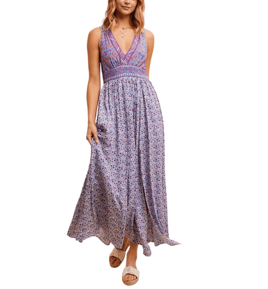 Effortlessly chic, this sleeveless maxi dress features a thoughtfully placed border print, thick elastic back waistband, criss-cross back with self...