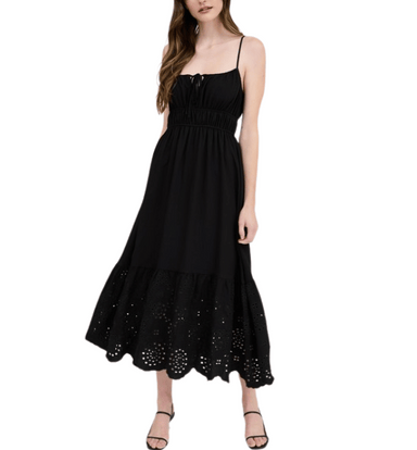 Romantic and breezy, this black eyelet dress features a front self-tie detail, scalloped hem, and adjustable straps for the perfect fit. Finished i...