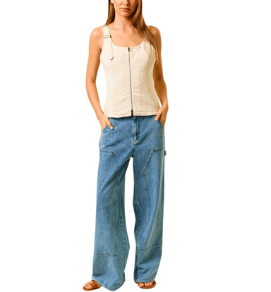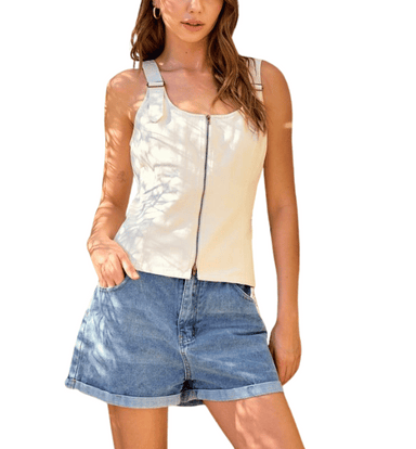 This cotton twill top features a flattering double scoop neckline, adjustable buckle straps for a custom fit, and a front zip-up closure for a mode...