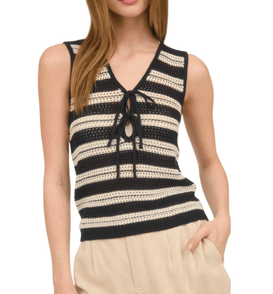 Breezy and feminine, this sheer crochet knit pullover features a sleeveless design, V-neckline, and front tie detail. The striped pattern adds text...