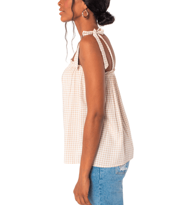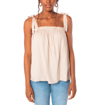 This gingham print tank top features a breezy, loose-fitting bodice with tie shoulder straps and an elastic neckline trimmed in soft ruffles. Made ...