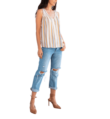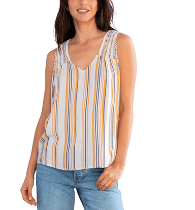 This summer-ready striped tank top features a flattering V-neckline, smocked back yoke detail, and a relaxed silhouette for an effortless, breezy f...