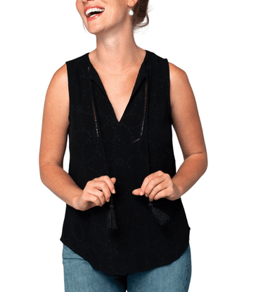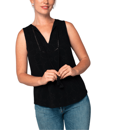 This eyelet tank top is a breezy summer essential, featuring a split neckline with tassel tie front and delicate lattice trim detailing. Fully line...