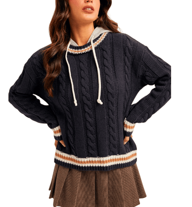 This contrast hoodie sweater knit top offers a cozy and casual look, designed with a soft knit construction and a contrasting hood for added style....