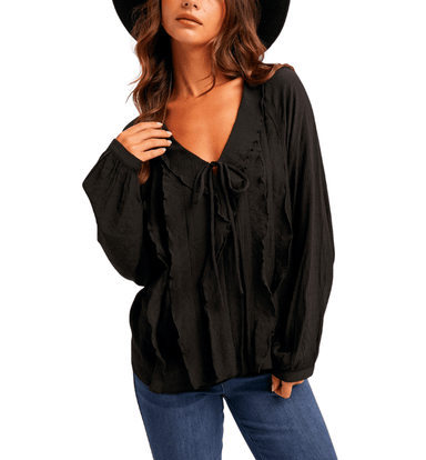 The V-Neck Ruffle Long Sleeve Blouse offers a feminine and effortless look with its soft drape and flattering silhouette. Designed with delicate ru...