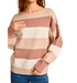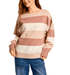 This long sleeve boat neck striped oversized sweater offers a relaxed and cozy fit with a classic striped pattern. Designed with a wide neckline and comfortable drape, it pairs effortlessly with jeans or leggings for an easy everyday look. Model is 5'8" with a 32A bust, 24" waist, and 34" hips, wearing a size small. Fabric content: 42% acrylic, 30% polyester, 28% nylon.
