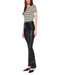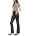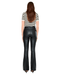 These vegan leather high-rise bootcut pants are designed with a sleek black finish, comfortable stretch, and an exposed button detail for a modern touch. Featuring a classic five-pocket style and a wide 2-inch hem, they offer a flattering silhouette with a front rise of 11 inches and a 32-inch inseam in size 5/26. Made from 100 percent PU with a blend of polyester and spandex for added comfort and flexibility.