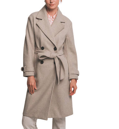 View full detailsThis double breasted belted wrap coat features a lapel collar, side pockets, and a tie front with button closure for a classic, polished look. Desi...