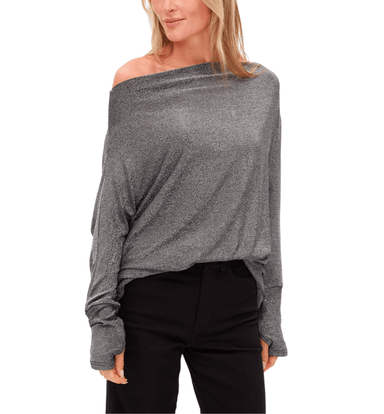 Long Sleeve Deep Neck Sparkle Rib Top. A fitted ribbed knit with subtle sparkle, perfect for dressing up or adding a touch of shine to any look. Mo...