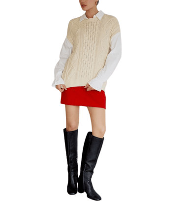 Effortlessly chic, this Collared Cable Knit & Shirt Mix Long Sleeve Top gives you a stylish two-fer look in one easy piece. The cream-white cab...