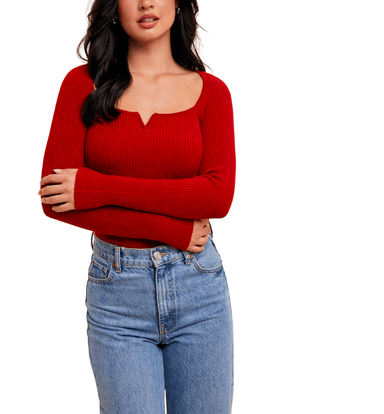Ribbed Knit Notched V Neck Top. This long sleeve fitted top features a ribbed knit texture and a flattering notched V neckline, making it an easy s...